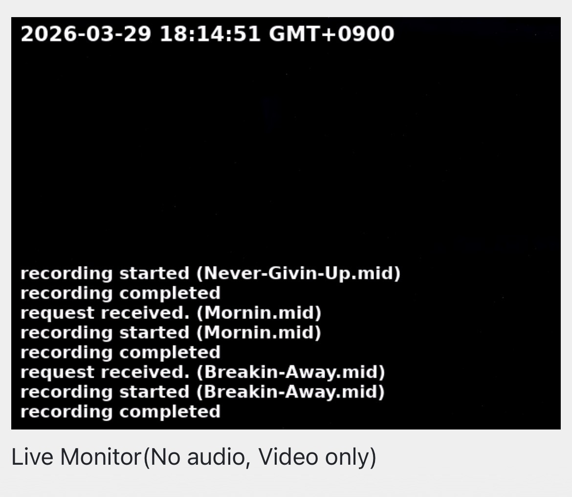 The Basic Recording feature now includes an automatic power ON/OFF function for the synthesizer (YAMAHA MU1000). As a result, when there are no active requests, the Live Cam screen will appear completely dark. Thank you for your understanding.